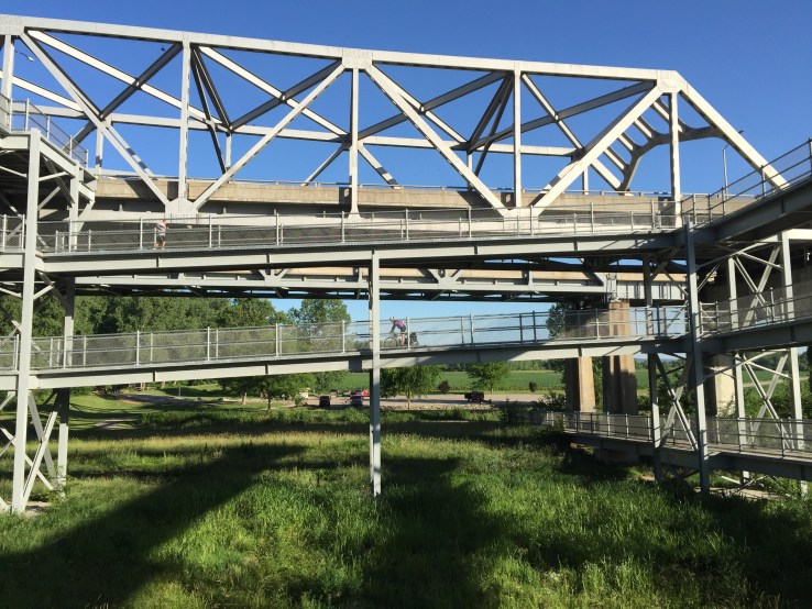The Katy is on the other side of the Missouri River from Jefferson City, so we had to cross back over the bridge. There is a square spiral ramp that takes you back down from the bridge deck to the ground below where the spur trail joins to take you back to the Katy. That’s Joe on his bike in the picture below. What I didn’t realize is that the reason he was going so low down the ramp is that he had yet another flat tire, a mere 3 miles from our start, and only 5 miles from getting brand new tires.