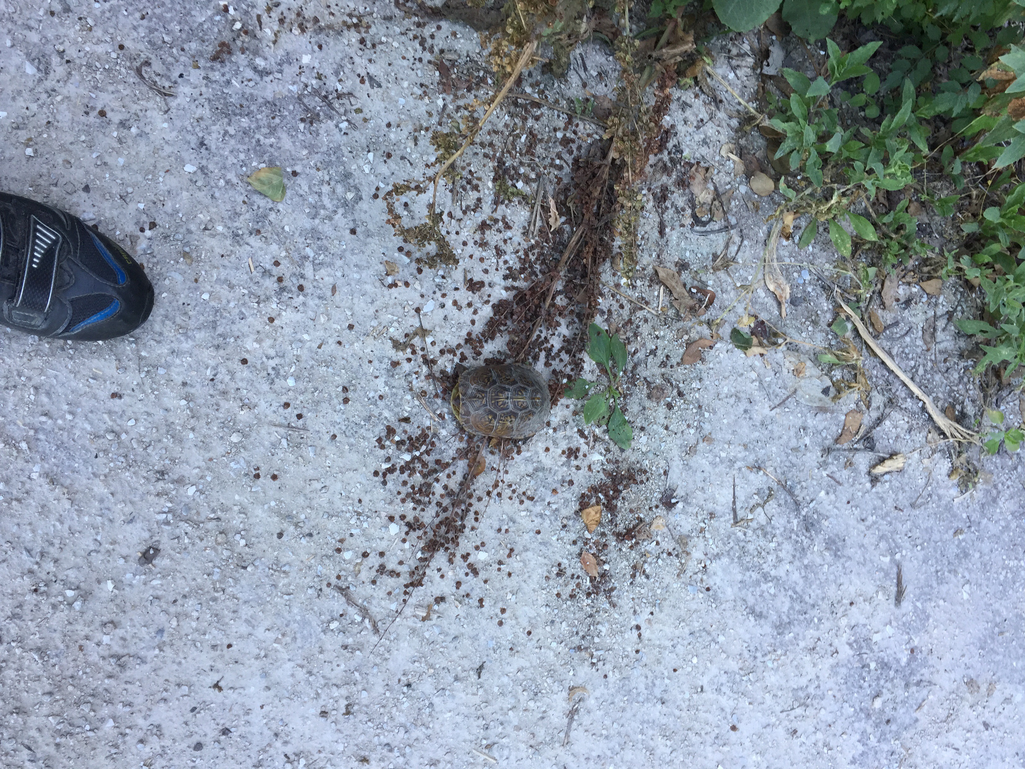 We’ve seen some wildlife on the trail. Not nearly as much as I had expected, but a few critters have shared our ride. Yesterday, we saw several deer. Today, I think I ran over a medium sized black snake that darted out as we were cruising along. We’ve also seen a few turtles. I stopped to get a picture of this cute little guy. He’s a bit camera shy.