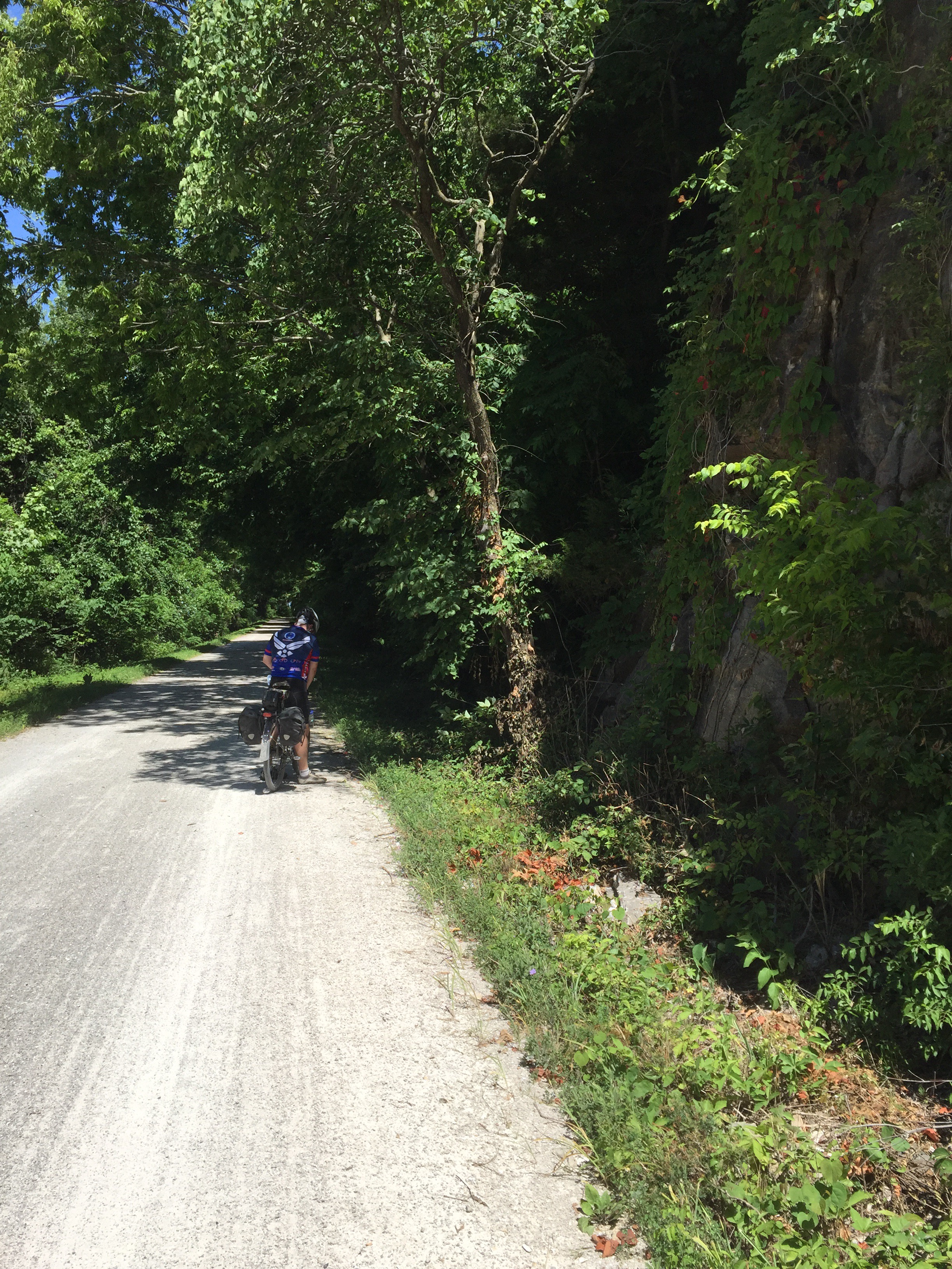 Less than a mile after seeing the caboose, I heard a strange ticking and hissing noise coming from my front tire. I knew what it was and quickly found one of the few precious patches of shade under a tree adjacent to the trail. There was a sharp stone sticking out of the bottom of my tire. When I pulled it out, the tire quickly hissed out all of the air. The Katy trail had finally claimed one of my tires as its victim. I decided to save that pesky little stone as a souvenir. We had the tube changed in record time, after all, we’ve had lots of practice lately.
