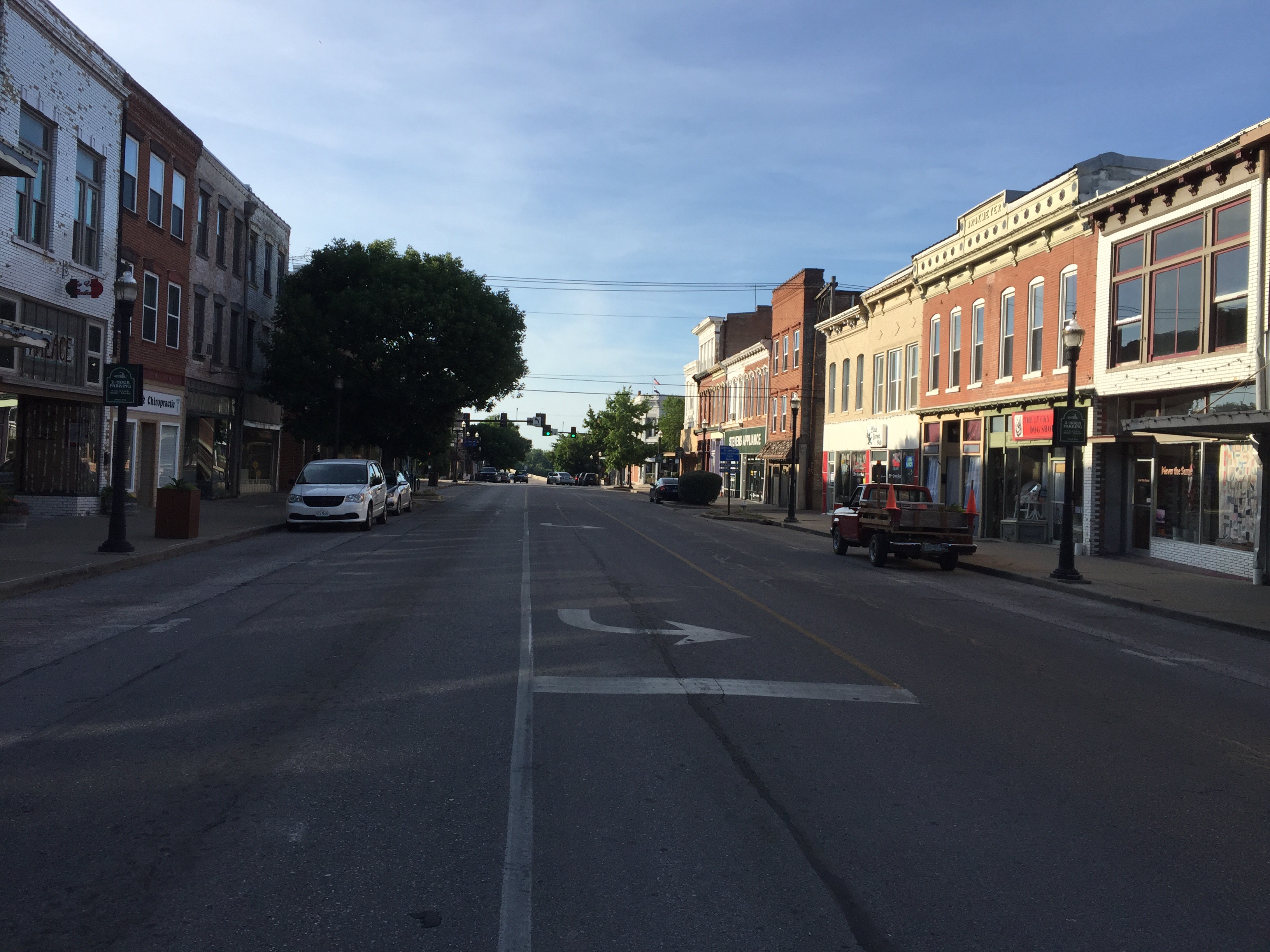 Getting into Boonville requires crossing a tall bridge over the Missouri. From this point forward, the Katy and the Missouri diverge to go their own separate ways. We put it into low gear and ground the pedals to climb up and over the long bridge into town.