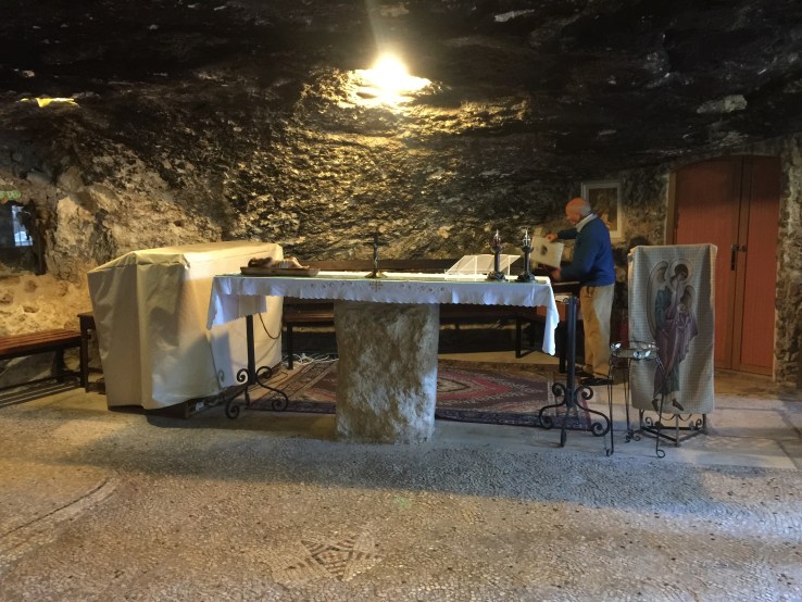 After you emerge from the cave, you come up on the other side of the main sanctuary space. Here’s a better shot of the main sanctuary. This is set up for the eastern-rite mass – notice the two sets of doors they’d use during liturgy.