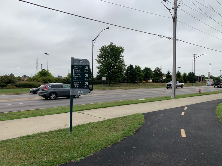 About 100 yards east of here, there is a new bike trail that takes you along the edge of downtown and westward. When you get to the end of the trail, it is an easy ride west on Franklin Road and then Franklin Avenue to get to 65th street.