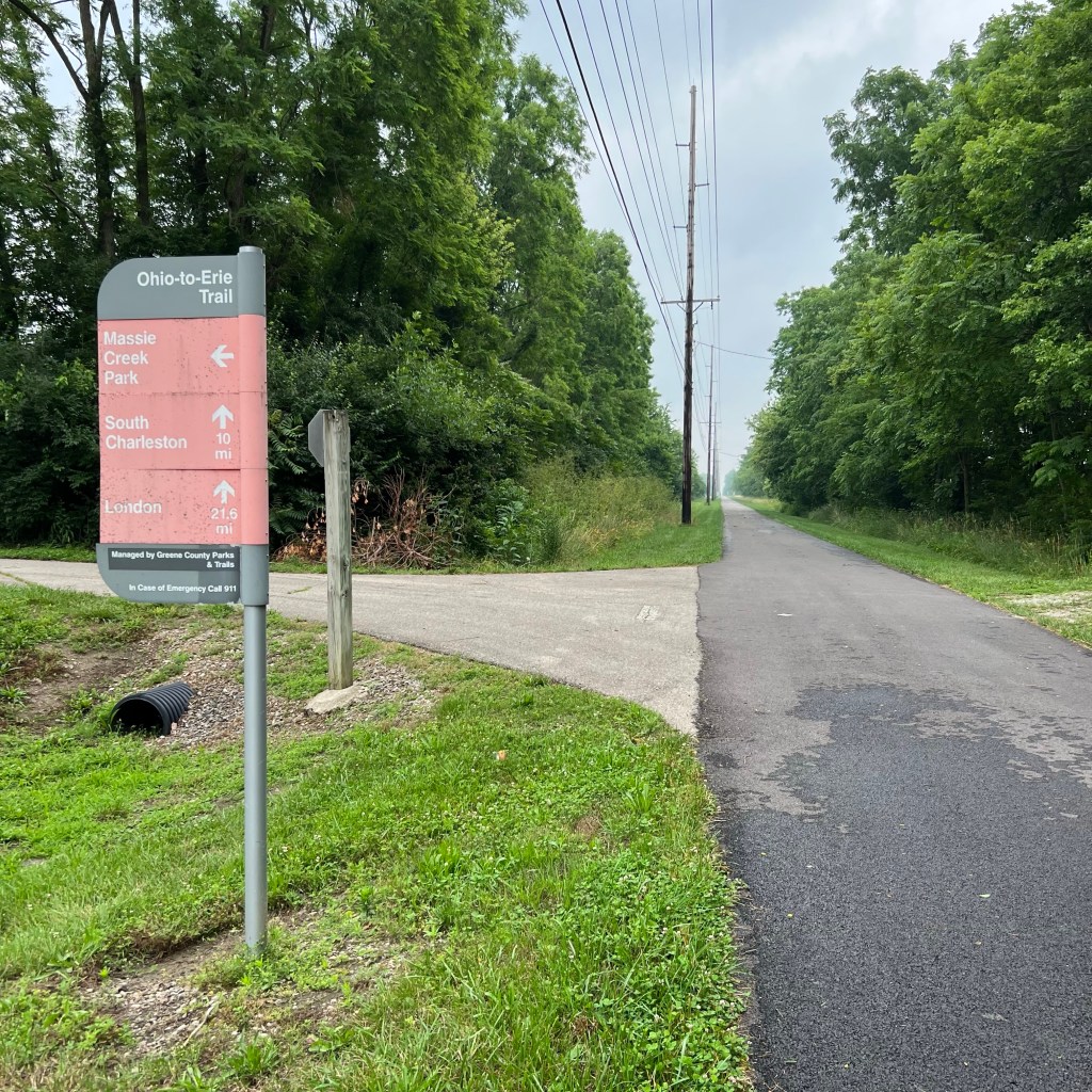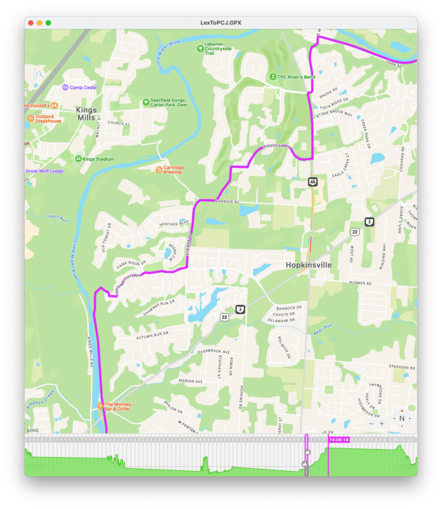 There was one significant detour from the regular route north of Loveland, OH. The Little Miami Trail has a huge construction project next to the Peterson Cartridge Factory (See the “Cartridge Brewing” marker in the map below). There is an official detour that you can find online, but I didn’t use it. The posted detour takes you up on busy roads for a good distance. Instead, I found a way that takes you through a residential neighborhood and back down to the trail with only 0.5 miles on a wide shoulder of Route 48, then back to the trail at the South Lebanon trailhead. My detour has a punchy climb at the start, but then is mostly easy riding.
