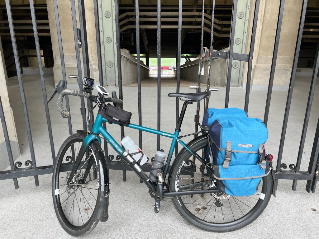 Next, my equipment. I’ve already mentioned my equipment in the past, but a quick overview for those who are new or curious about bike touring. I’m using a bicycle that is designed for a bit heavier use than a typical road bike. It has thick wider tires, a steel frame, and eyelets to allow you to bolt on racks and bottle holders. The best way I can describe it is by comparing to cars: my touring bike is like an SUV, my road bike is like a sports car. Next is the luggage. I use panniers (pronounced “Pan-Ears”) that lock into the back rack of my bike. They’re waterproof and rugged. They allow me to carry clothes, food, electronics, and repair gear for the trip. I didn’t weigh them, but I estimate that I’m carrying about 20-25 pounds of luggage. I also have a little bag that velcros to my top tube. I put my wallet, pepper spray (which I’ve never used), and some energy food in this little bag so that I can easily access while riding. I also carry a tire pump in the event of a flat.