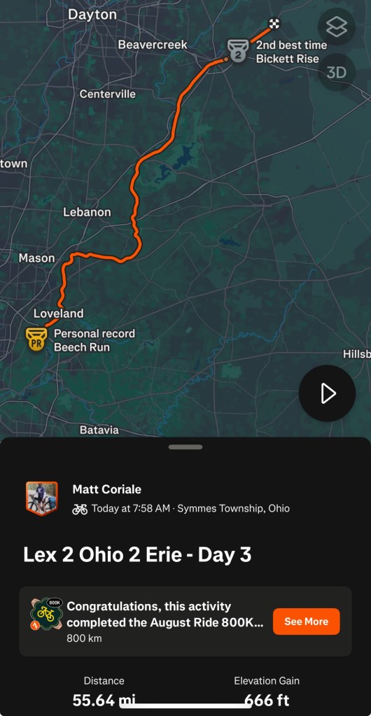 Our overall stats for this trip: 467.57 miles, no flats, and no mechanical issues whatsoever! Eight days of great weather. Just a couple of saddle sores.
